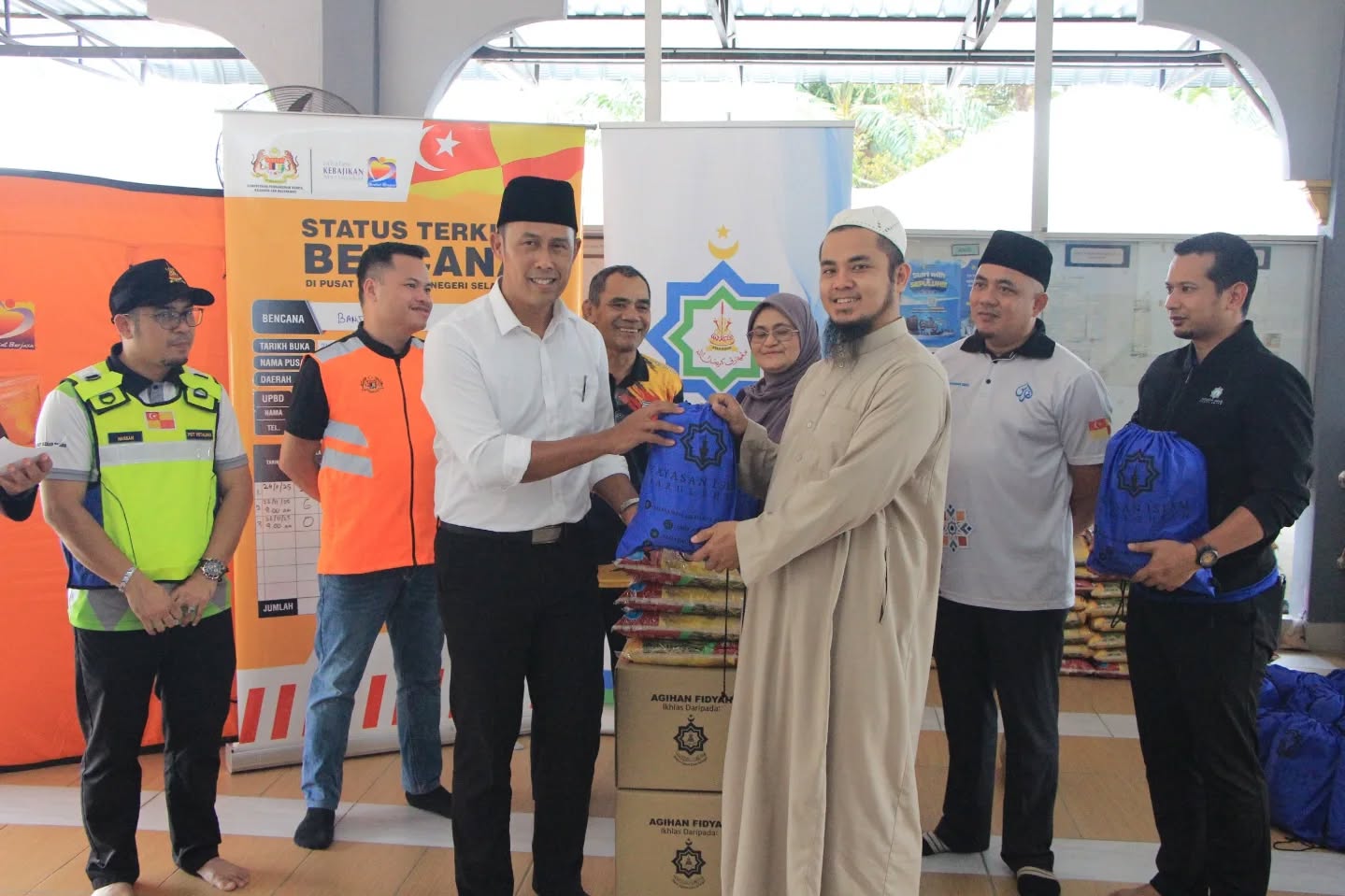 Majlis penyampaian bantuan disempurnakan oleh YBhg. Tuan Haji Mohd Sabirin bin Mohd Sarbini, Setiausaha MAIS di Pusat Pemindahan Sementara (PPS) di Masjid Al-Falah Kampung Budiman, Meru.
