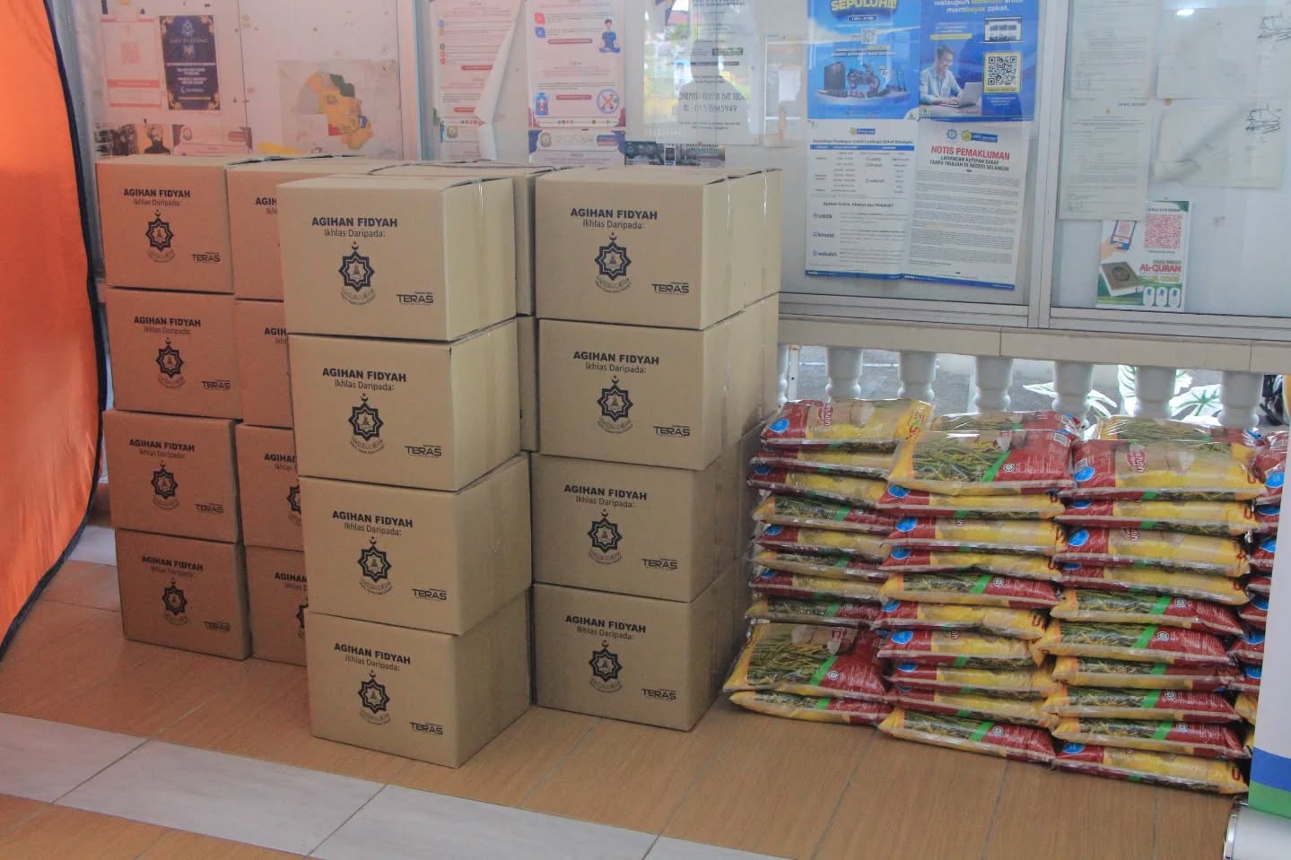 Setiap ketua keluarga menerima kotak makanan kering berupa beras, gula,minyak masak,tepung gandum, susu, bihun, kicap, sos, biskut, makanan dalam tin dan minuman coklat.