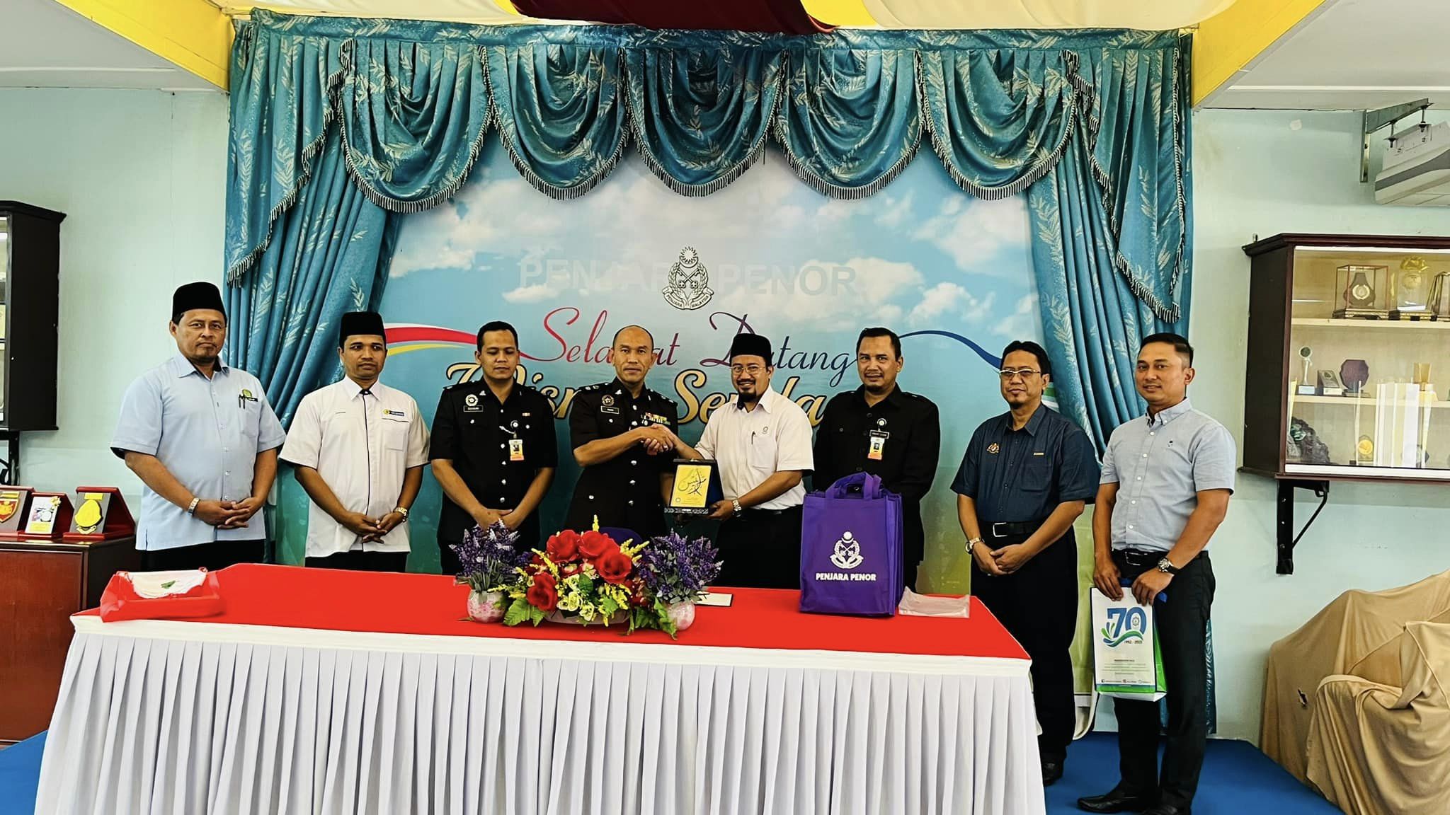 Delegasi MAIS seramai 20 orang pegawai diketuai oleh Ustaz Suhaimi Ismail, Pengarah Pembangunan Sosial MAIS disambut mesra oleh Tuan Ahmad Ikhwan Naim Mohf Zin, Timbalan Pengarah Penjara Penor.